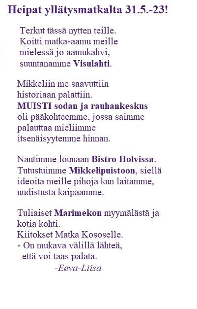 Varmasti moni yhtyy mielipiteeseeni, että olipa hyvä esitys ja reissu, siitä jäi iloinen mieli pitkäks aikoo. -Päivi